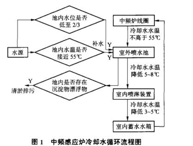 該冷卻系統(tǒng)以潛水泵為動力,噴水池和噴淋架為兩級冷卻裝置,以達(dá)到中頻爐冷卻水循環(huán)使用的目的。當(dāng)水溫超過中頻爐冷卻要求<(55℃)及水量蒸發(fā)損失較多時,則由補(bǔ)水管路及時補(bǔ)充,同時及時排污,保持清潔?!鋮s水池還可為噴水池周邊綠地灌溉,使水資源得到綜合利用。